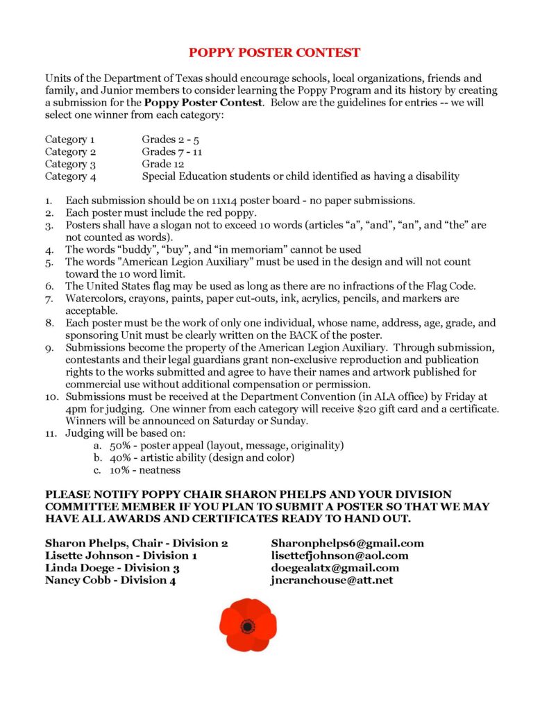 The Poppy Committee would like to announce they are holding a Poppy Contest. Entries should be brought to Department Convention for judging. Rules and guidelines are below.